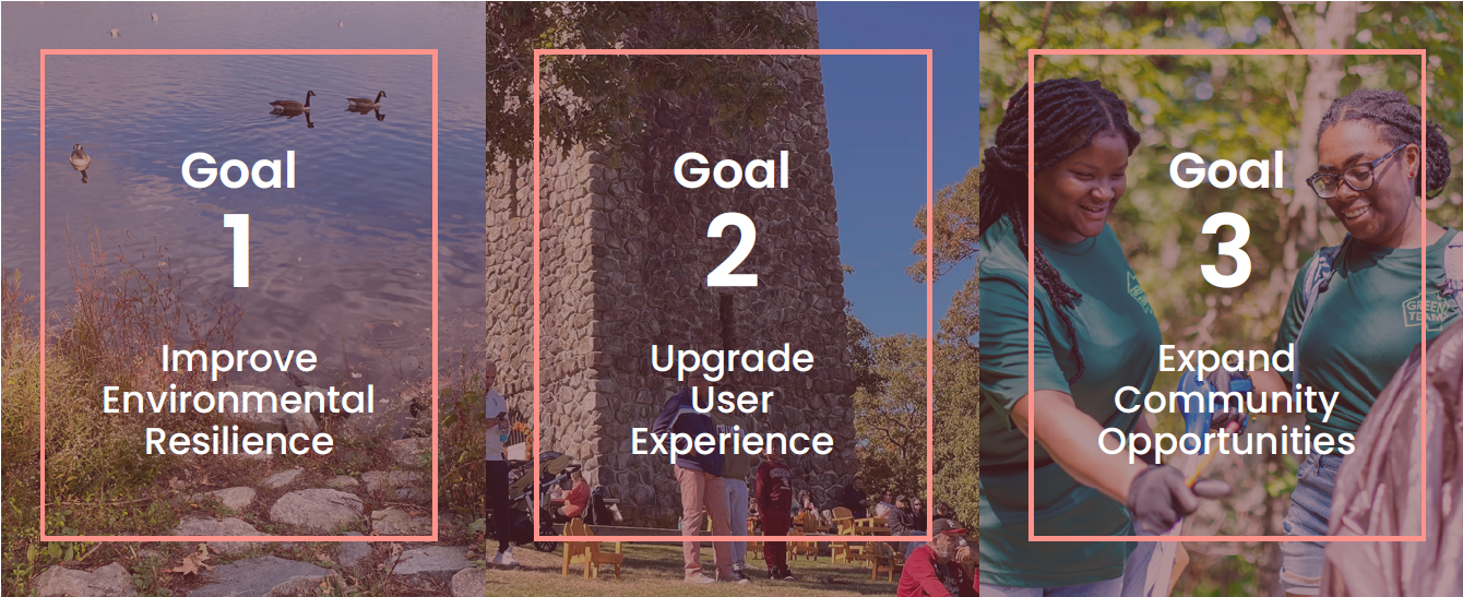 Working collaboratively, D.W. Field Park Initiative partners developed 3 overarching goals and identified 13 capital improvement projects based on findings from community surveys, scientific studies and assessments, and strategic planning sessions. Graduate landscape design students created conceptual designs to inspire future possibilities for key gathering areas and roadway sections.