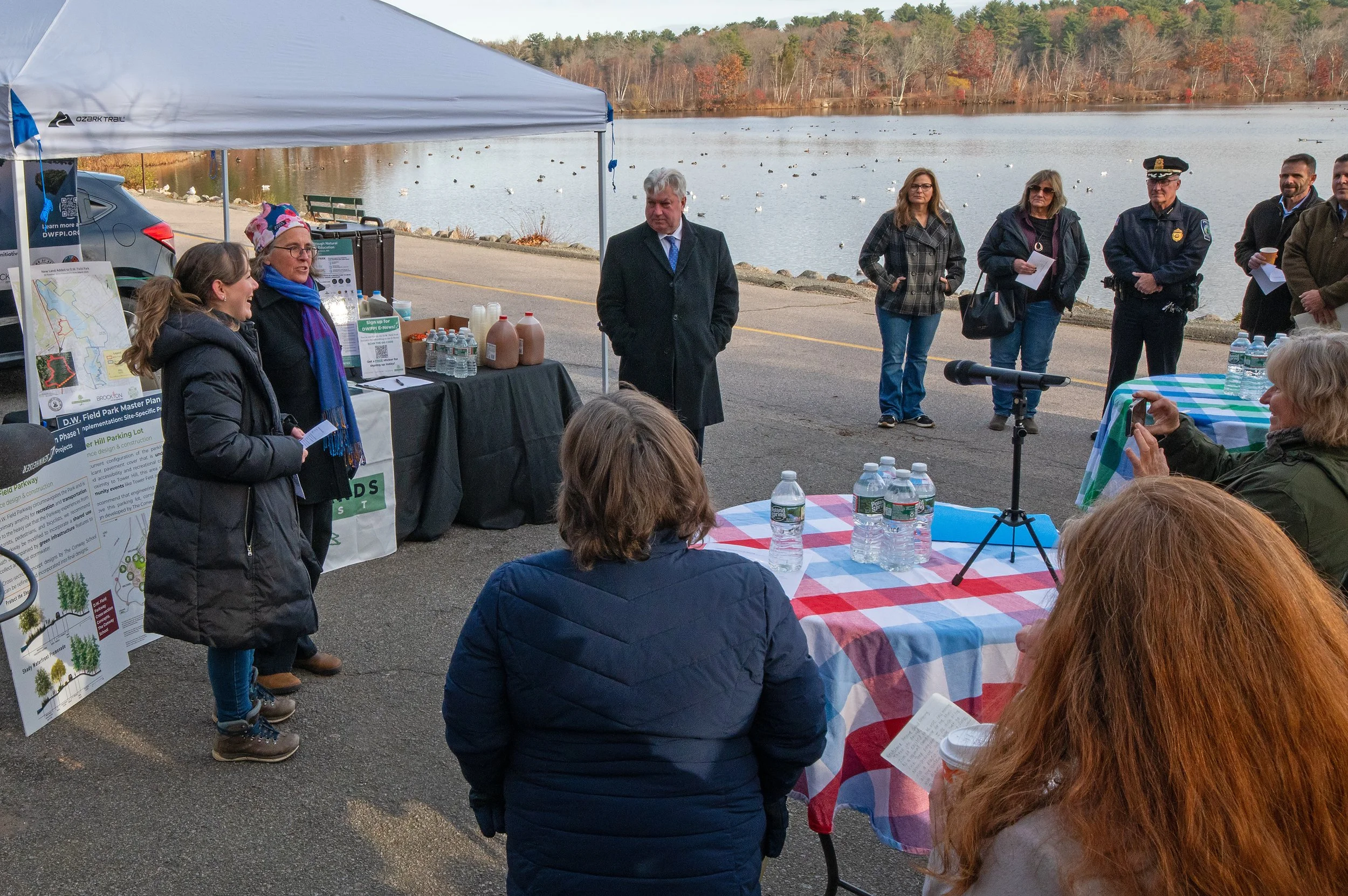 Speakers at the grand opening included City of Brockton Mayor Robert Sullivan, Massachusetts Senator Michael Brady, Town of Avon Select Board Member Shannon Coffey, Brockton City Councilor Shirley Asack, Wildlands Trust President Karen Grey, Old Colony Planning Council Executive Director Mary Waldron, and MVP Coordinator Carolyn Norkiewicz. Plymouth-based poet Tzynya Pinchback also read a poem inspired by D.W. Field Park through the Writing the Land initiative.