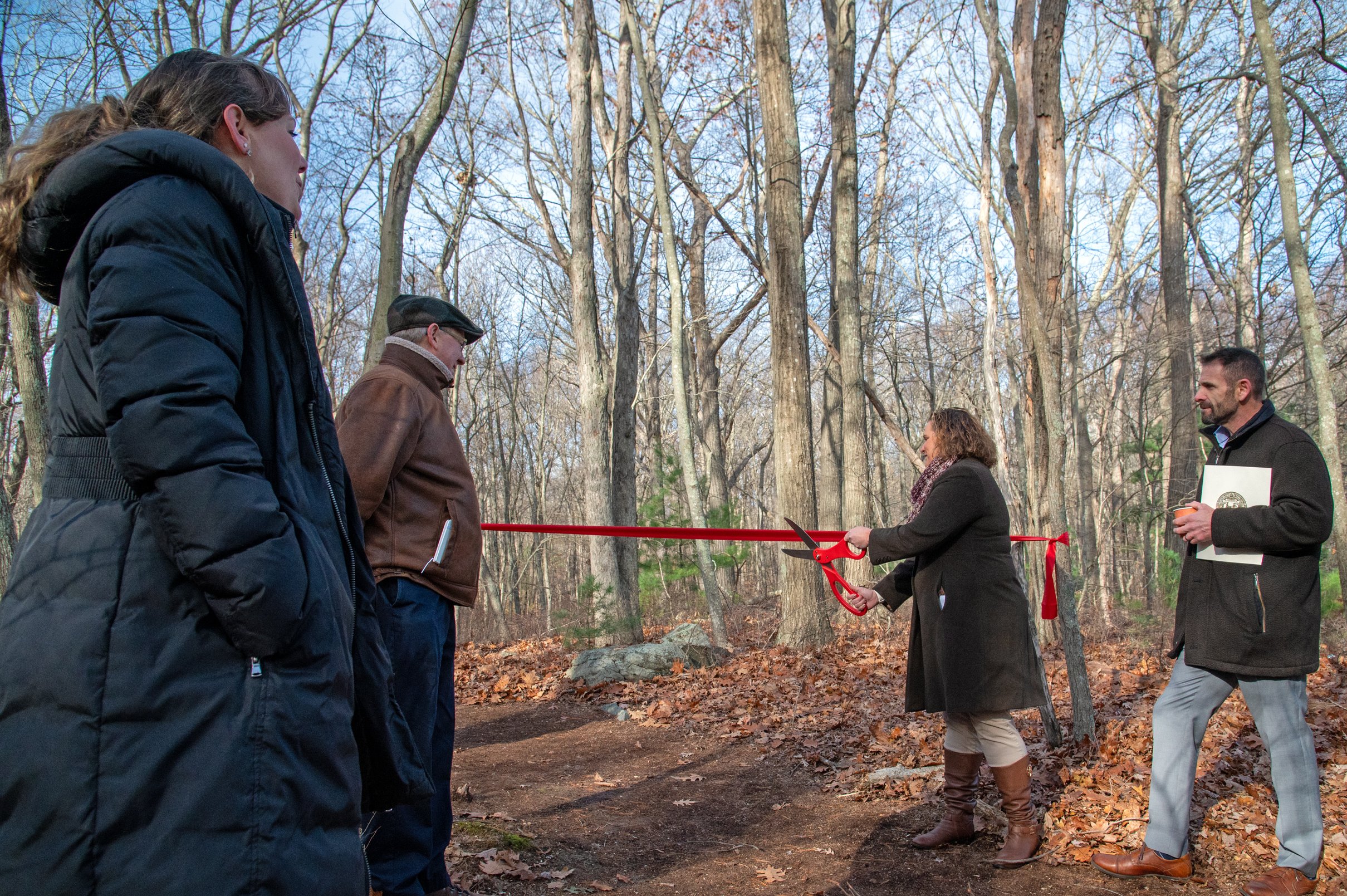 After the remarks, Selectwoman Coffey cut a ceremonial ribbon to officially open Fieldstone Preserve to the public. A public hike of the new trail ensued, guided by Wildlands Trust staff.